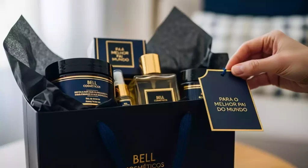 Todos os kits da Bell Cosméticos vêm em bolsas ou caixas elegantes, prontas para presentear. Nada de improviso. Cuidamos de cada detalhe para que a experiência do seu pai comece antes mesmo de abrir o pacote. A composição visual, os materiais e o acabamento reforçam o cuidado por trás do gesto.
